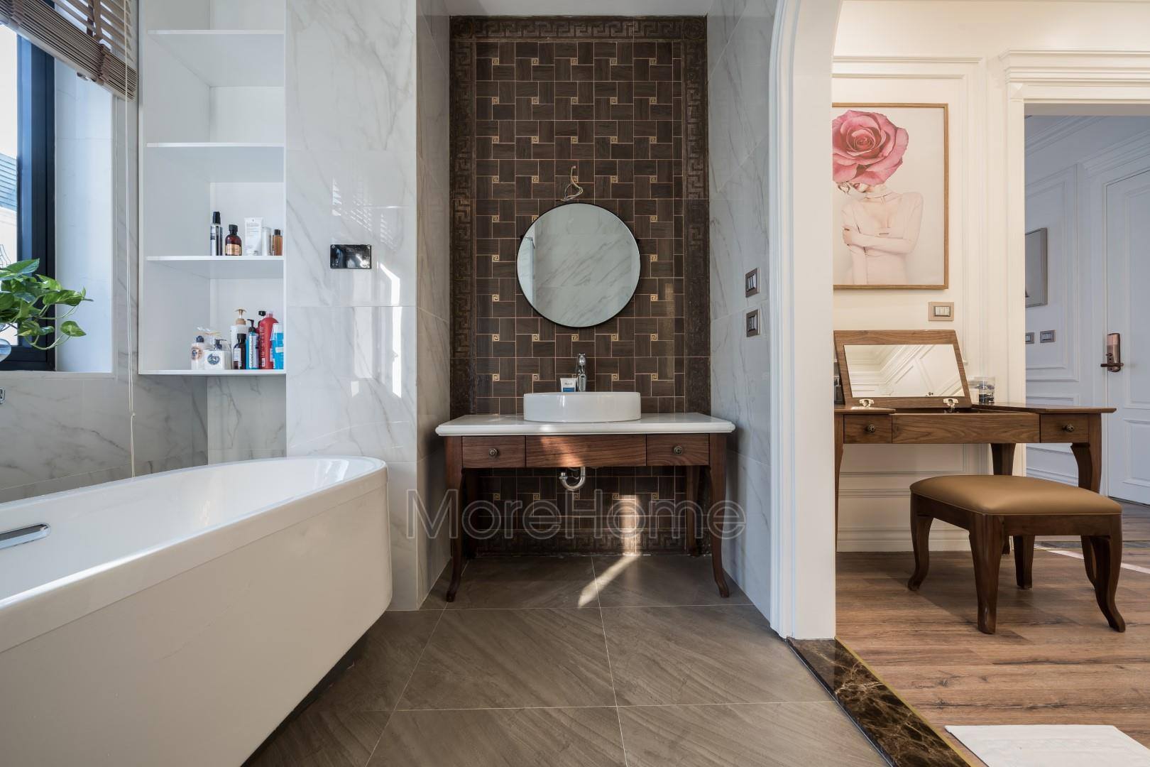 Bên cạnh phòng ngủ khách sạn được thiết kế không gian phòng tắm hiện đại tinh tế. Phòng tắm sử dụng thiết bị vệ sinh cao cấp. Cụ thể là: đặt một chiếc bồn tắm trắng tinh tế, một không gian vệ sinh với chiếc bàn gỗ và chiếc gương hình tròn được đặt tại mảng tường ốp gạch cao cấp tạo nên sự sang chảnh cho không gian phòng tắm.