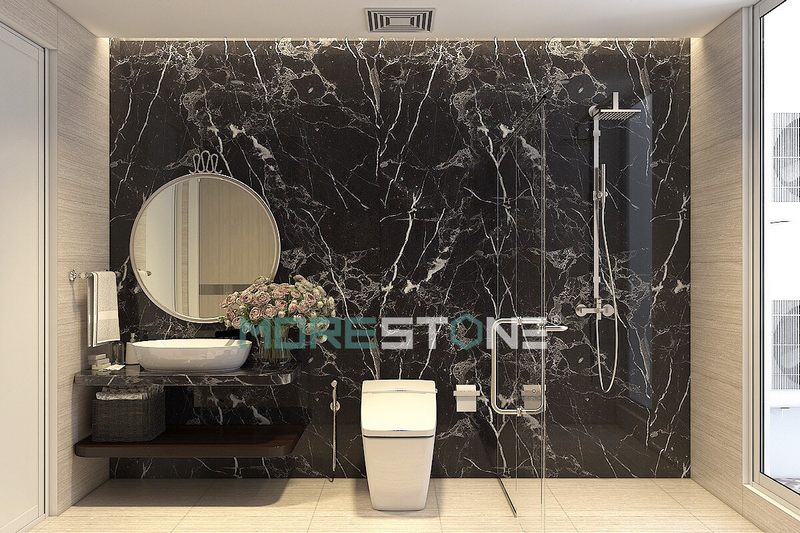 Gạch lát nền màu đen vân mây hiện đại điểm nhấn cho không gian phòng tắm.