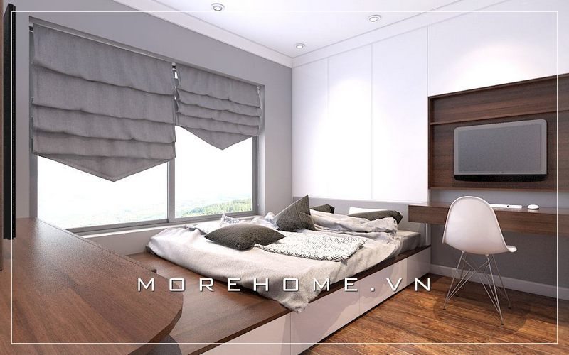 Thiết kế nội thất phòng ngủ chung cư nhỏ, chiếc giường ngủ hiện đại, kệ tủ ti vi treo tường... tất cả được sắp xếp một cách hợp lí tạo sự tiện nghi nhất cho gia chủ