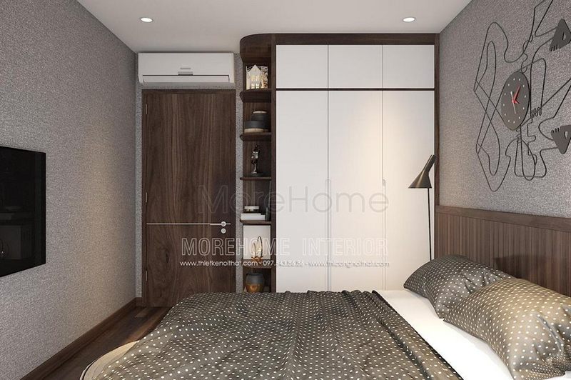 Nội thất phòng ngủ nhỏ được bố trí hợp lí, tủ quần áo dạng lùa, kệ ti vi treo tường...vừa mang lại sự thoải mái, tiện nghi, vừa tiết kiệm được tối đa diện tích của căn phòng