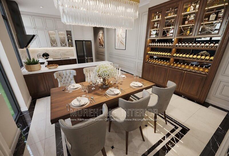 Bố trí nội thất phòng ăn phòng ăn tân cổ điển đẹp, quý phái với không gian bàn ăn dành cho 10 người nhưng vẫn rộng rãi thông thoáng.