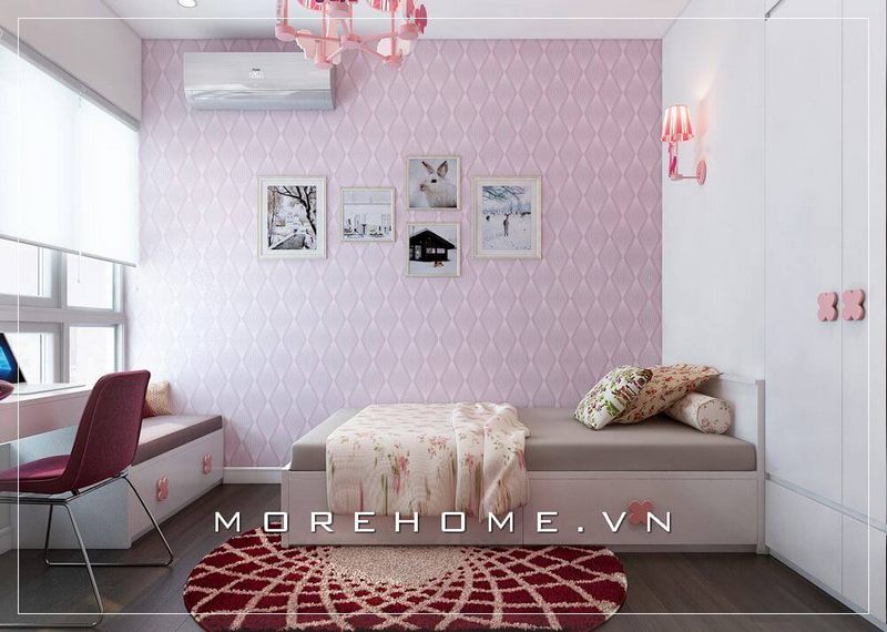 Nội thất phòng ngủ bé gái hiện đại, nữ tính, chiếc giường ngủ gỗ công nghiệp màu hồng thông minh có ngăn kéo phía dưới tạo sự tiện dụng cho con