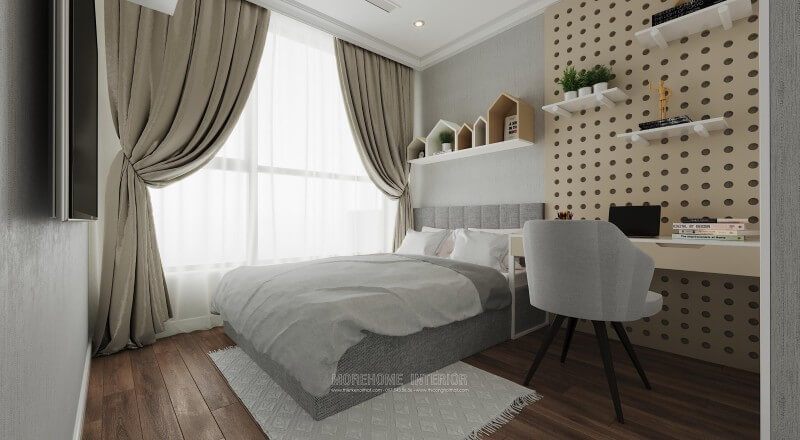 Phòng ngủ Master sang trọng và thanh lịch với mẫu giường ngủ bọc nỉ xám be tinh tế