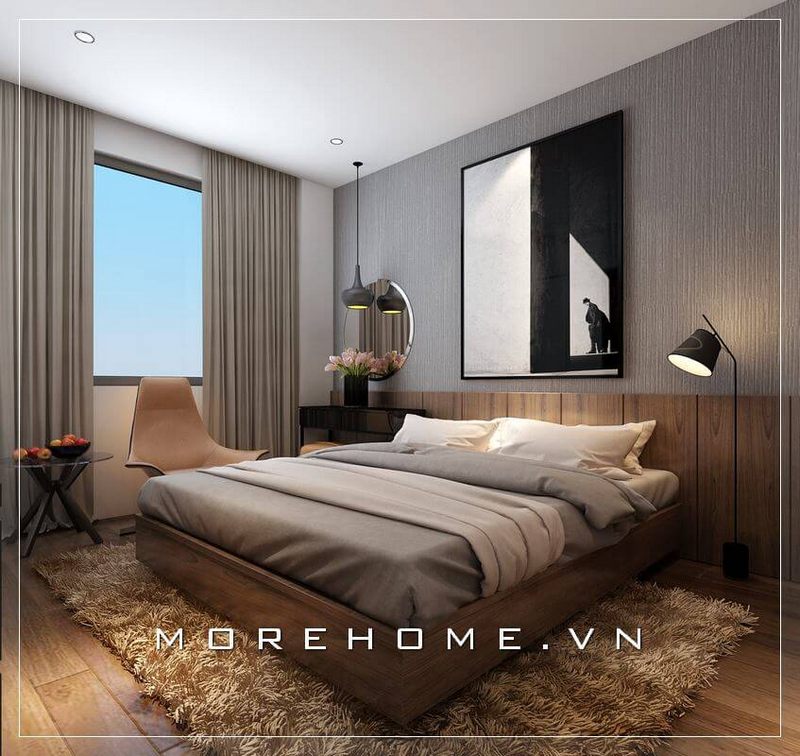 Giường ngủ gỗ công nghiệp với gam màu vàng trầm ấm được gia chủ lựa chọn cho không gian phòng ngủ chung cư hiện đại