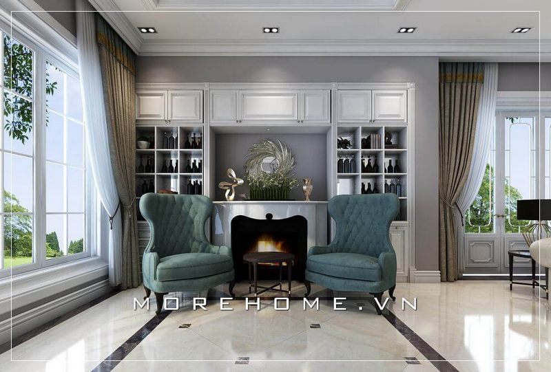 Thiết kế phòng khách tân cổ điển với nội thất sofa bọc vải sang trọng, đường cong ấn tượng, tinh tế