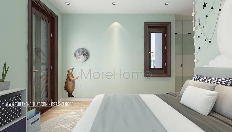 Thiết kế nội thất phòng ngủ bé trai phong cách hiện đại, chát liệu gỗ công nghiệp phù bóng gương tạo độ thoáng hơn cho căn phòng