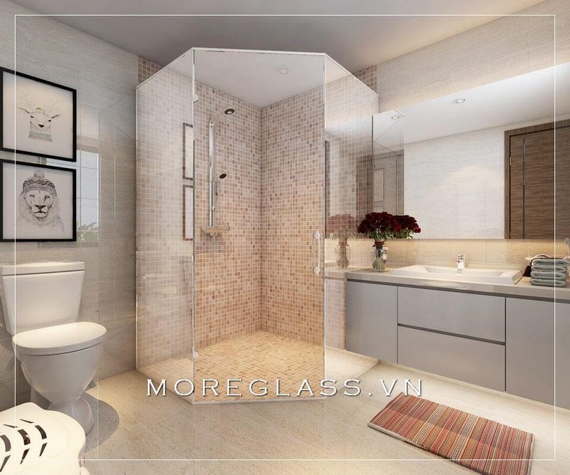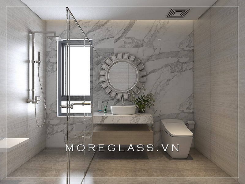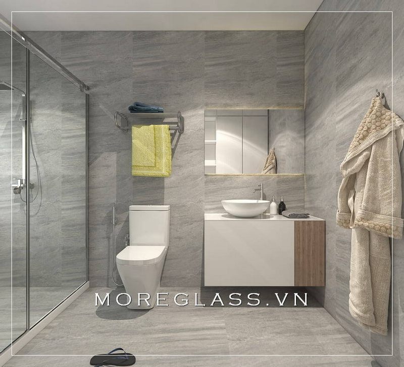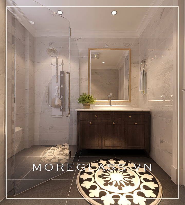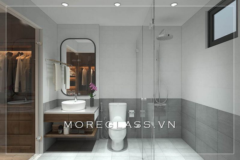 Mẫu nhà tắm và nhà vệ sinh hiện đại với phòng tắm kính cường lực cao cấp, nhỏ gọn giúp chia ra hai khu vực, mang lại cảm giác thoải mái cho căn phòng.