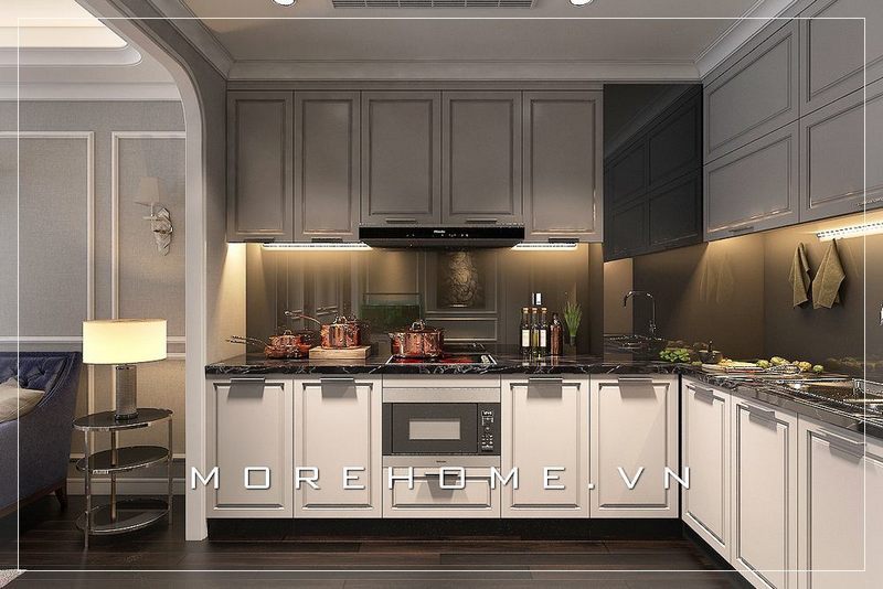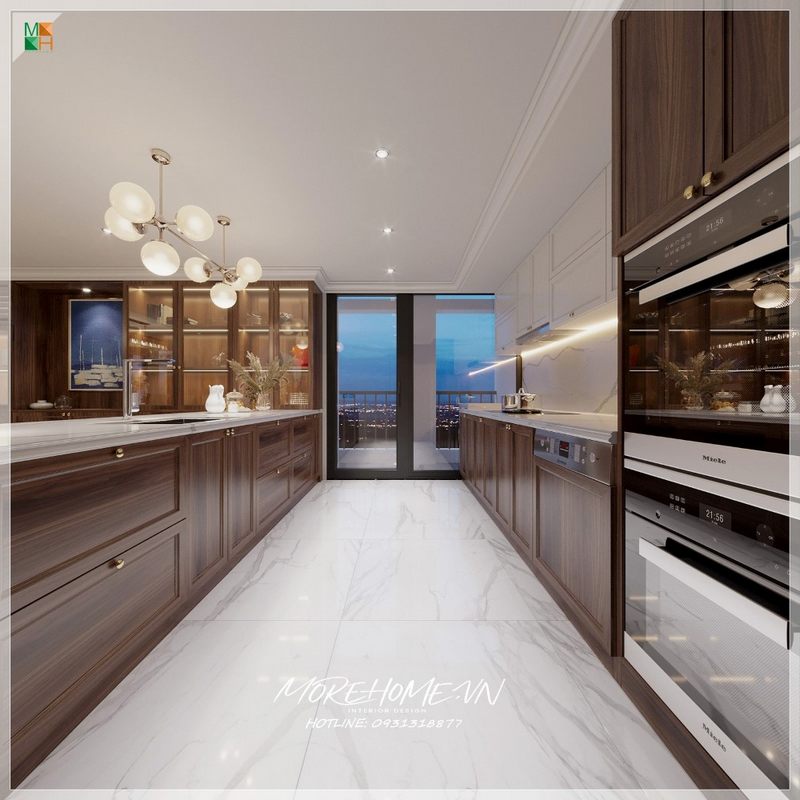 Không gian bếp được thiết kế theo phong cách tân cổ điển và sang trọng, với các thiết bị bếp hiện đại giúp căn bếp trở nên tiện nghi hơn.