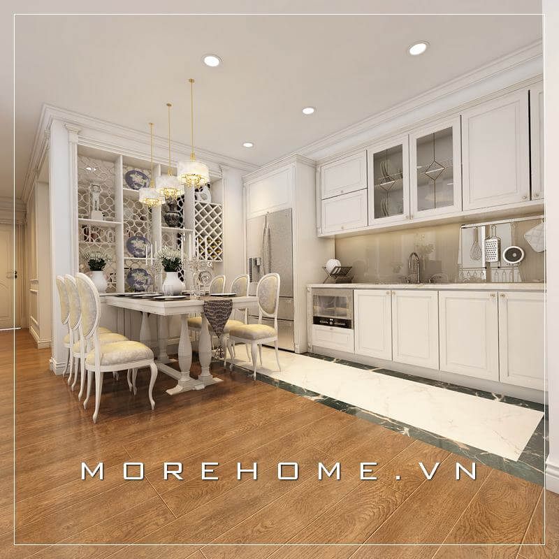 Bộ bàn ăn 6 ghế có kiểu dáng cổ điển sang trọng sẽ làm cho phòng ăn chung cư trở nên ấn tượng.